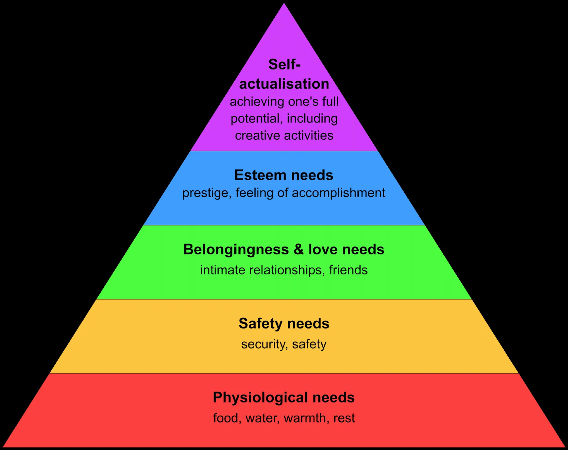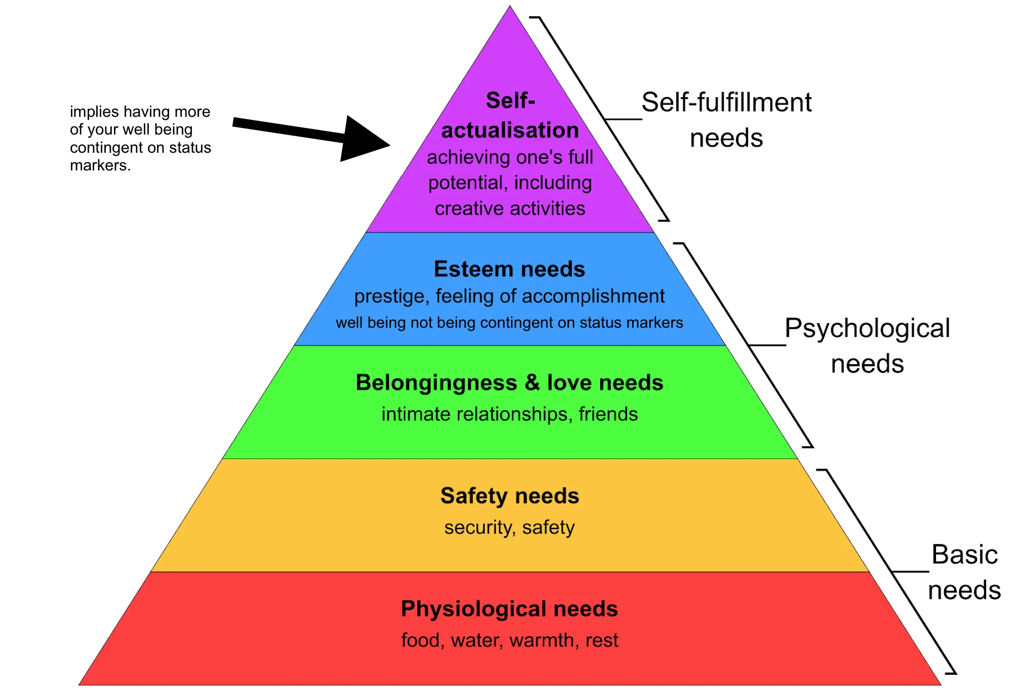 One of the difficulties with constructing any psychological model is that it will always have the mark of its creator embedded in the model. In this case, I think it’s likely that Maslow included self-actualization and esteem needs because those were their main routes they took towards self acceptance. That is to say, self acceptance through achievement and “achieving one’s full potential”. It would make sense that such a prolific academic would no doubt believe that prestige and accomplishment were vital to their own existence.