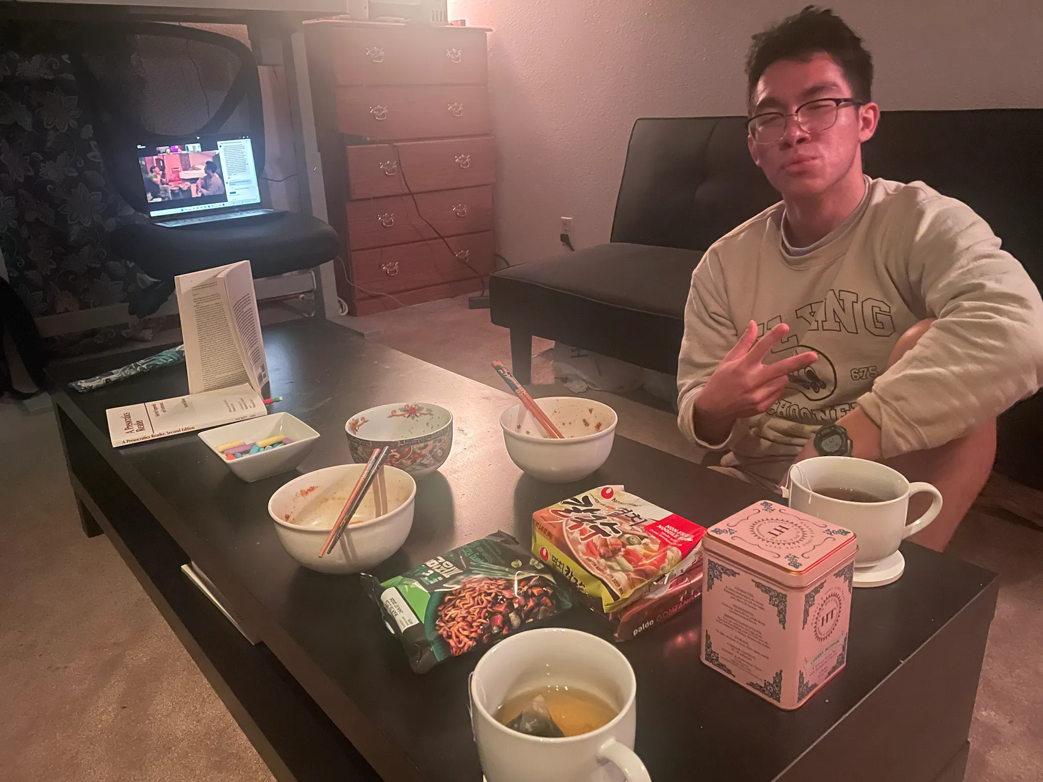 Highlight: Hojae comes over for 3am ramen after a long day of working. We talk about the Pre-Socratic philosophers, the implications of AI on Engineering, and the likely post-AGI resurgence of the Humanities. He thinks my jokes are hilarious. David and Henry are still working.